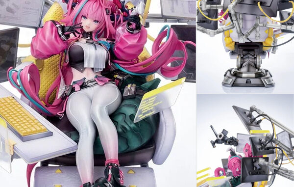 イヴォンヌはエルゴノミクスチェアにもたれ、幾重にも重なるディスプレイに囲まれた姿で立体化。精密に仕立てられたトップスに、白からピンクへとグラデーションがかかったロングパンツを合わせています。クロップドジャケットの袖口は、透明/不透明素材の組み合わせを再現し、パール塗装とホログラム調の仕上げを使い分けることで、重なり合う質感を表現。奔放なカーブを描くツインテールと、背後でうねる尻尾には多彩な色彩が施され、イヴォンヌらしい個性とトレンド感を際立たせます。