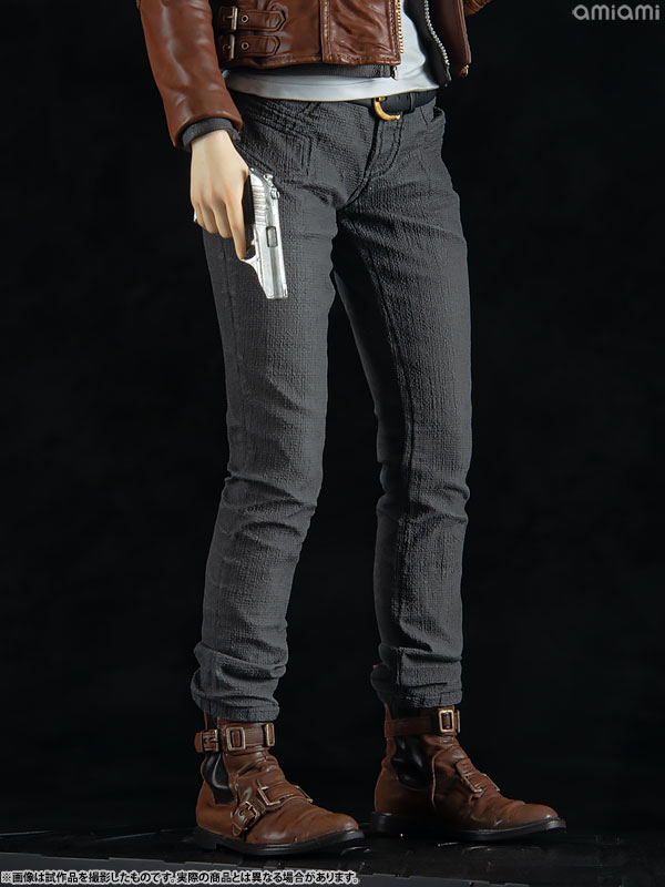ジャケットの革の質感、衣裳の生地感は精密な彫刻を入れた上で塗装を施すことでリアルな質感を再現。