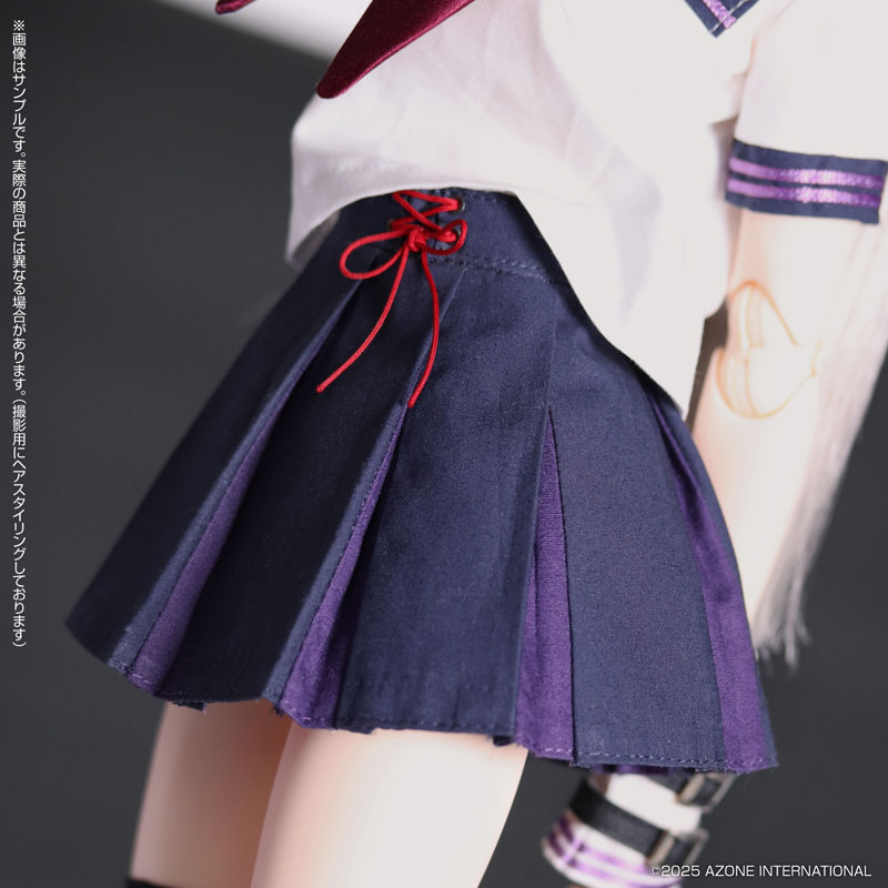 スカートのひだの内側はパープルのライン!ウエストにはハトメを使用した赤い紐の編み上げが施されており、こだわりのディティールに!